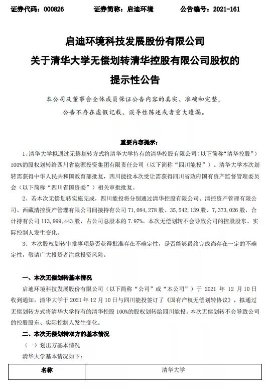 城發(fā)環(huán)境吸并啟迪環(huán)境一事,又有新消息。 不過,這一次不是兩家公司自己的動作,而是啟迪環(huán)境的母公司有了新變動。 12月11日,啟迪環(huán)境發(fā)布公告稱,四川省能源投資集團有限責任公司(下稱“四川能投”)與清華大學于12月10日簽署《國有產權無償劃轉協(xié)議》,以無償劃轉方式接收清華大學持有的清華控股100%股權...