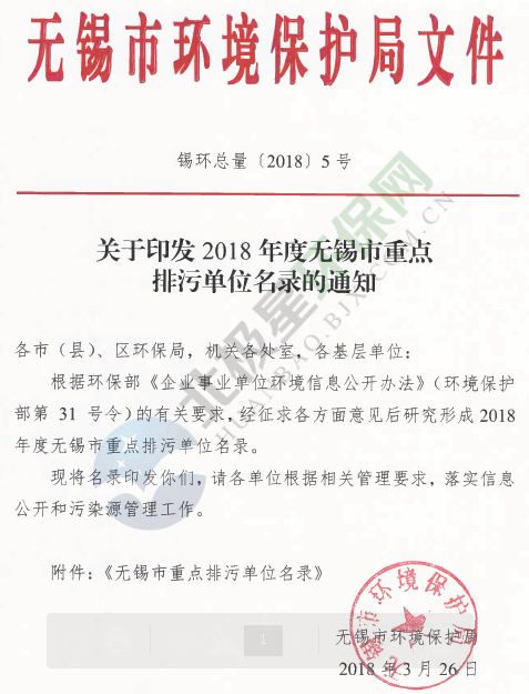 無錫市環(huán)境保護(hù)局發(fā)布了《關(guān)于印發(fā)2018年無錫市重點(diǎn)排污單位名錄的通知》,涉及大氣污染物排放、污水處理及工業(yè)固廢處置等排污企業(yè)共180家,具體內(nèi)容如下: