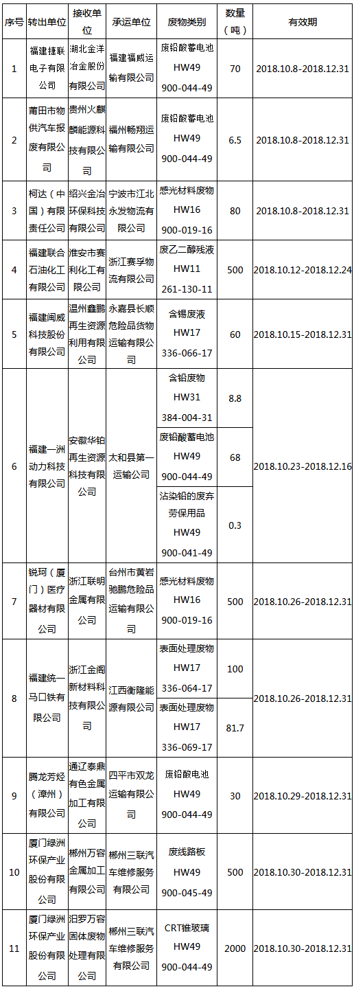 日前福建省環(huán)境保護廳發(fā)布了《2018年10月福建省危險廢物跨省轉移情況公告》,共有11項,具體內(nèi)容如下: