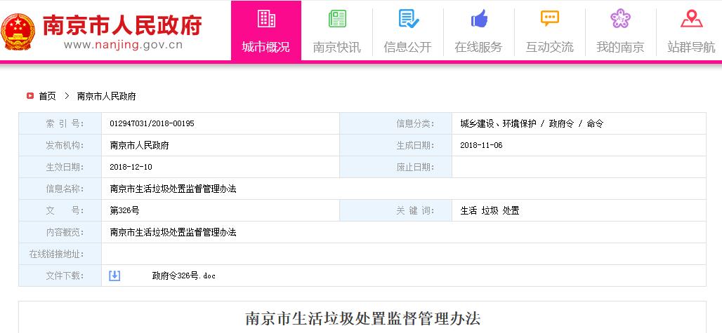 《南京市生活垃圾處置監(jiān)督管理辦法》日前公布,詳情如下:南京市生活垃圾處置監(jiān)督管理辦法第326號(hào)《南京市生活垃圾處置監(jiān)督管理辦法》已經(jīng)2018年10月31日市政府第23次常務(wù)會(huì)議審議通過(guò),現(xiàn)予公布,自2018年12月10日起施行。市長(zhǎng):藍(lán)紹敏2018年11月6日南京市生活垃圾處置監(jiān)督管理辦法第一章 總...