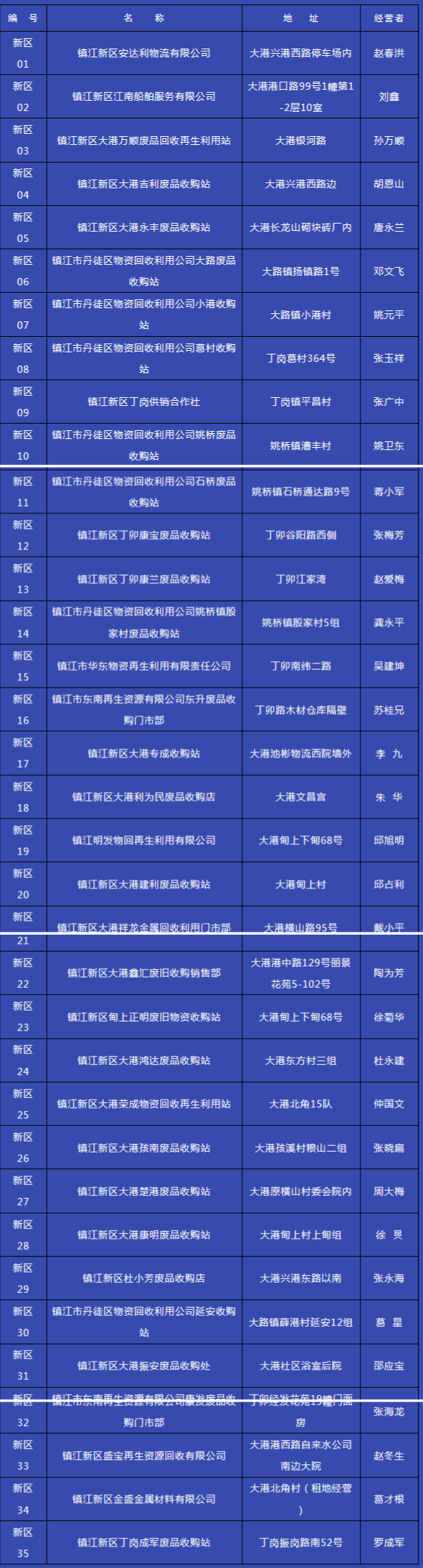 根據(jù)《江蘇省特種行業(yè)治安管理?xiàng)l例》規(guī)定,對(duì)生產(chǎn)性收購(gòu)業(yè)實(shí)行名錄管理制度。符合條件的,由所在地市、縣人民政府公安機(jī)關(guān)列入名錄,并向社會(huì)公布?,F(xiàn)將己列入名錄的35家生產(chǎn)性業(yè)公布如下:期間,上述生產(chǎn)性廢舊金屬收購(gòu)業(yè)的經(jīng)營(yíng)名稱(chēng)、地址、經(jīng)營(yíng)者等發(fā)生變更的,應(yīng)及時(shí)到公安機(jī)關(guān)進(jìn)行報(bào)備。市公安局新區(qū)分局二O一八年十...