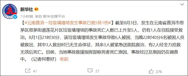 8月1日普洱市思茅區(qū)蓮花片區(qū)垃圾填埋場發(fā)生事故致6人被困目前事故死亡人數(shù)已上升至5人# 事件經(jīng)過 #8月1日21時30分,普洱市思茅區(qū)相關(guān)部門接到報警,思茅街道蓮花片區(qū)垃圾填埋場有人被困。事故發(fā)生后,市委、市政府和思茅區(qū)委、區(qū)政府高度重視,市區(qū)兩級迅速成立“8.01”事故救援指揮部進(jìn)行現(xiàn)場緊急救援。...