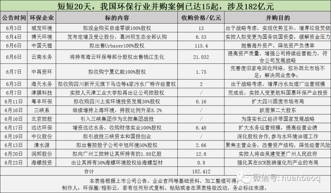0120天15起收并購交易資金近200億元首先,從數(shù)量和金額上,今年上半年我國環(huán)保產(chǎn)業(yè)收并購活動比往年愈發(fā)猛烈,其數(shù)量之多和金額之大也刷新了歷史紀(jì)錄,創(chuàng)下了近年來之最(詳細(xì)數(shù)據(jù)見文末)。僅在剛剛過去的20天里(6月3日-6月23日),據(jù)筆者不完全統(tǒng)計(jì),我國環(huán)保行業(yè)收并購案例就高達(dá)15起,粗略估算交易...