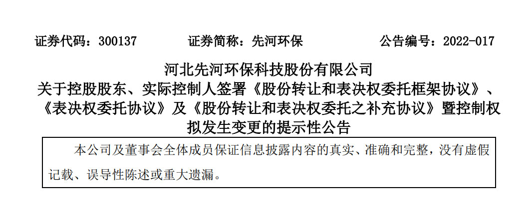 五一前后,環(huán)保行業(yè)大事不斷,前有博天環(huán)境和龍凈環(huán)保先后ST,后有先河環(huán)??刂茩嘁字鳌?月4日晚間,先河環(huán)保公告稱,公司控股股東、實際控制人李玉國與青島清利新能源有限公司(下稱“清利新能源”)簽署協(xié)議,擬將其持有的先河環(huán)保的566.75萬股股份轉讓給清利新能源,同時還將其持有的先河環(huán)保5186.95萬...
