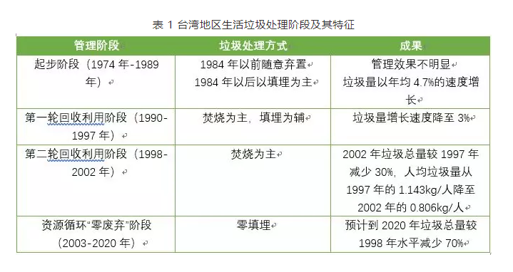 臺北是臺灣省的六個“直轄市”之一,也是臺灣省的政治、經濟、文化、旅游、工業(yè)、商業(yè)與傳播中心,人口密度居臺灣第二位。臺北地少人多,大量生活垃圾的處理問題曾一度困擾臺北市政府。為了從源頭上降低垃圾產生量,減輕環(huán)境負荷,臺北市從20世紀80年代開始,耗時近30年分階段采取不同措施(如表 1),綜合運用法律手段和經濟手段,實現(xiàn)了垃圾減量化和資源化的目標。