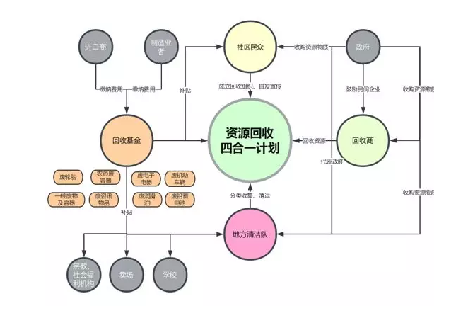 回收基金:督導責任業(yè)者繳交回收清除處理費,成立基金;運用獎助及補貼機制,推進資源回收處理體系建設;建立有效回收制度,暢通回收處理管道。