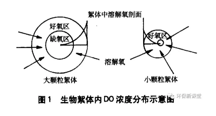 微生物絮體結(jié)構(gòu)不但影響生物絮體內(nèi)DO的擴散,而且影響碳源的分布,絮體結(jié)構(gòu)大小、密實度適中才有利于同步硝化反硝化。研究表明,微生物絮體的同步硝化反硝化能力隨活性污泥絮體大小的增加而提高。