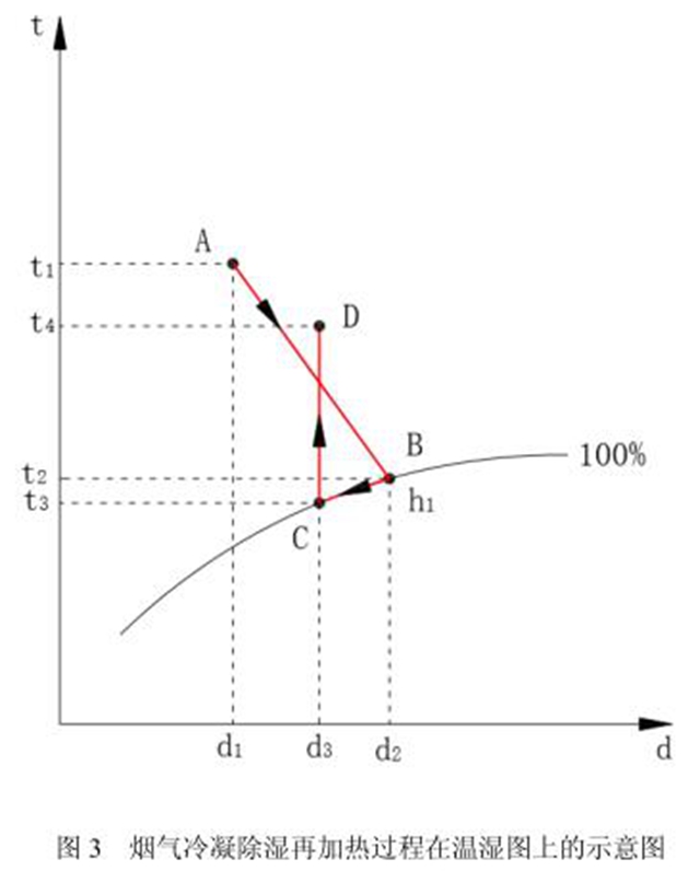 這是一個(gè)等焓增濕的過程。采用直接或間接的方式對(duì)飽和狀態(tài)B的煙氣進(jìn)行冷卻,部分汽態(tài)水釋放氣化潛熱發(fā)生相變而凝結(jié)為液態(tài)水,順著等100%的相對(duì)濕度線從B點(diǎn)處理到C點(diǎn),煙氣仍為相對(duì)濕度100%的飽和煙氣,但絕對(duì)濕度降低為d2-d3,煙氣中的水蒸氣含量降低。