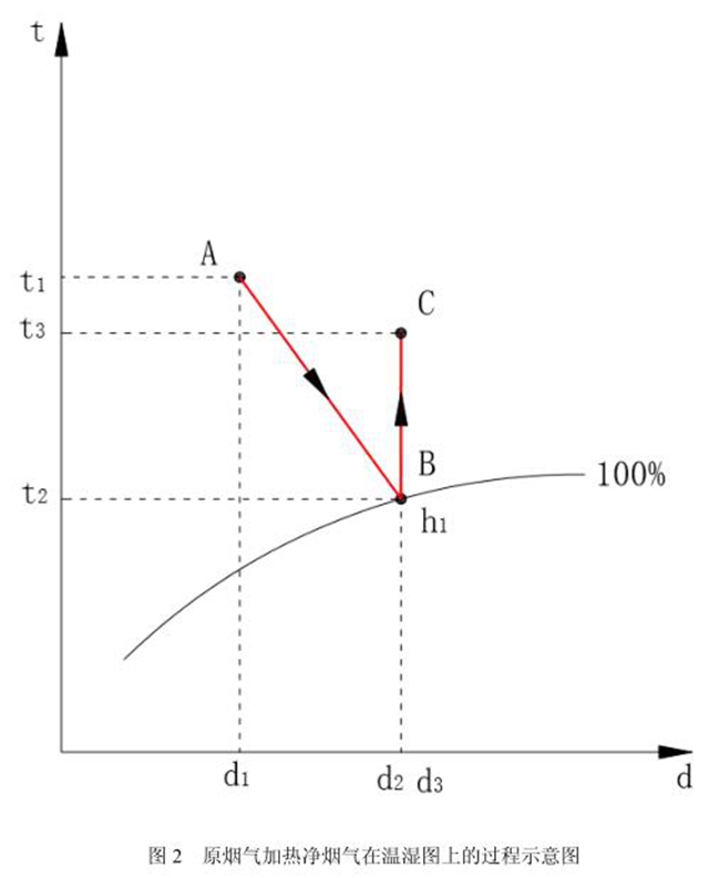 通過間壁式換熱器加熱凈煙氣,提高凈煙氣的溫度,降低凈煙氣的相對(duì)濕度。煙氣在焓濕圖上的處理過程如下圖 2 所示。