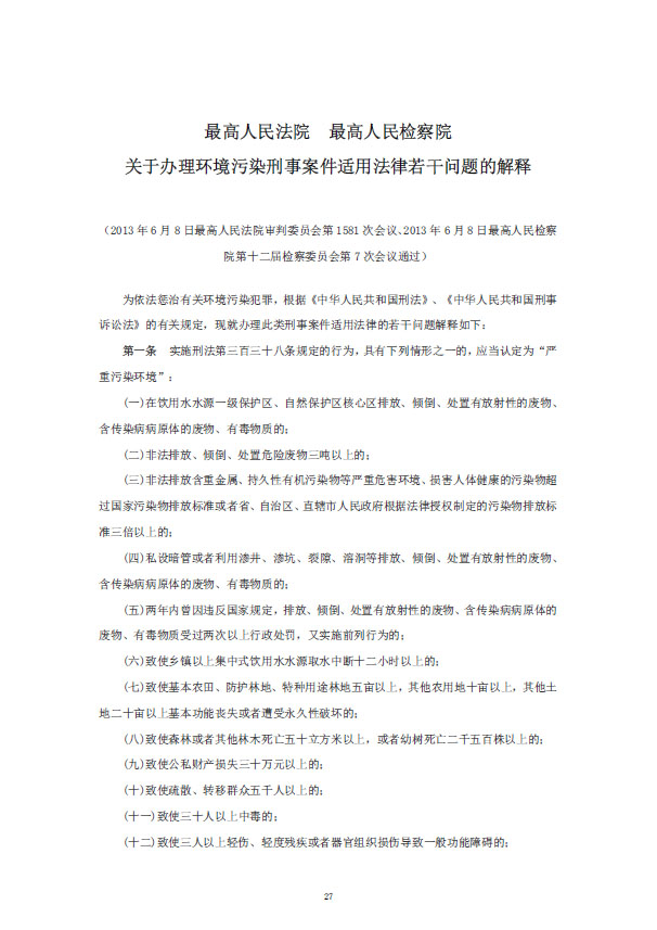 關(guān)于辦理環(huán)境污染刑事案件適用法律若干問題的解釋