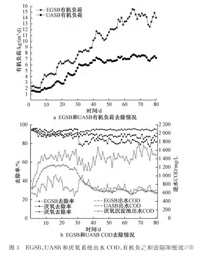 (2)穩(wěn)定運(yùn)行時(shí),EGSB、UASB和氧化溝的有機(jī)負(fù)荷分別為14.3kgCOD/(m3·d)、7.2kgCOD/(m3·d)和0.52kgCOD/(m3·d)時(shí),COD去除率分別為87%、80%和90.8%。