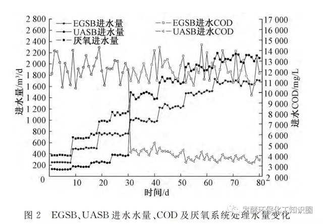 EGSB及UASB采用同類檸檬酸生產(chǎn)廠家厭氧顆粒污泥啟動(dòng),EGSB和UASB投加的含水率94%的顆粒污泥量分別是600m3和300m3,占各自反應(yīng)器容積的45%和30%。EGSB、UASB進(jìn)水水量、COD及厭氧系統(tǒng)處理水量變化見圖2。