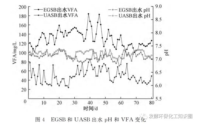 EGSB出水的VFA濃度在130±60mg/L;而UASB出水的VFA在50±25mg/L,UASB出水VFA低于EGSB出水VFA50%。上述EGSB和UASB的PH是適合甲烷菌生長(zhǎng)的,反應(yīng)器也沒有VFA的積累。同時(shí)UASB出水的VFA比EGSB出水的VFA低,也說明UASB中有機(jī)物降解的更加徹底。