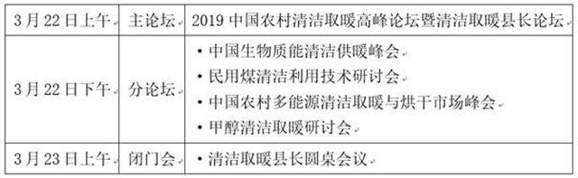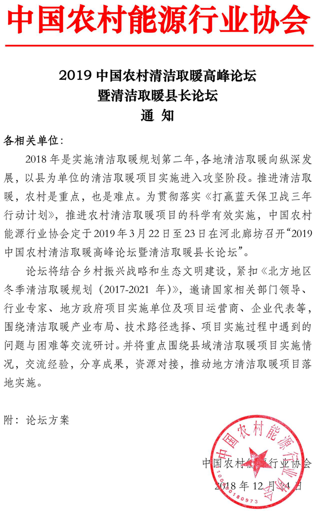 2019中國農(nóng)村清潔取暖高峰論壇暨清潔取暖縣長(zhǎng)論壇方案將于2019年3月22日至23日在河北廊坊新繹七修酒店隆重舉行。