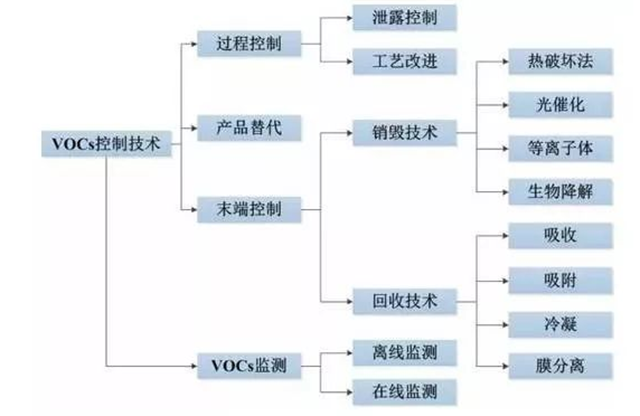根據(jù)大氣中VOCs產(chǎn)生的原理和VOCs的理化性質(zhì),其控制技術(shù)可以分為兩大類,過(guò)程控制和末端控制。過(guò)程控制是針對(duì)VOCs的生產(chǎn)過(guò)程,從VOCs的原理上減少VOCs的產(chǎn)生,一般通過(guò)工藝提升、技術(shù)改造和泄漏控制來(lái)實(shí)現(xiàn)。末端控制則是針對(duì)VOCs的化學(xué)特性,著力于VOCs廢氣的治理,利用燃燒、分解等方法來(lái)控制VOCs的排放。
