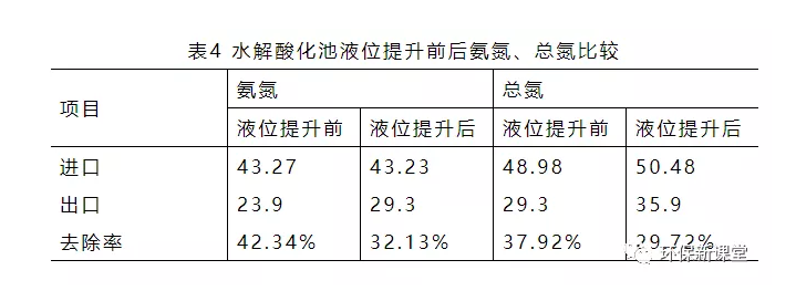 結(jié)合表2水解酸化池出水后B/C有一定的提高,在水解酸化池液位為提升前B/C由0.333提高到0.404,當(dāng)水解池液位提升后(停留時間增加0.2h)B/C由0.376降到0.375左右,說明停留時間增長,水解酸化池中消耗BOD5的微生物數(shù)量增多,反應(yīng)器向厭氧反應(yīng)的第三個階段進(jìn)行,對于后續(xù)的生化處理產(chǎn)生不良影響。