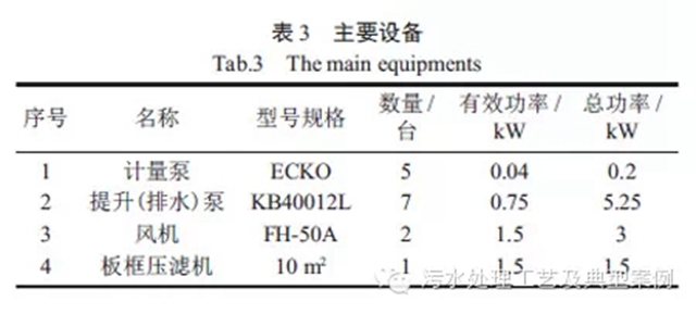 藥劑費:PAC,0.12 kg×1.8 元/kg =0.216 元/t;PAM,0.005 kg×24 元/kg=0.12 元/t;電費:裝機(jī)總?cè)萘考s為10 kW,實際運行約為5 kW,5kW×[0.50 元/(kWh)]/(2 m3/h)=1.25 元;人工費,實際運行時配備2 人(兼職),800 元×2 人/(30 d×20 t)=2.7 元/t。合計4.29 元/t。