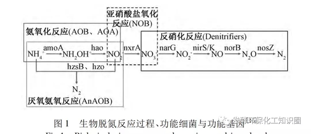 生物脫氮過(guò)程的主要功能微生物包括氨氧化細(xì)菌( Ammonia oxidizing bacteria,AOB) 、氨氧化古菌( Ammonia-oxidizing archaea,AOA) 、亞硝酸鹽氧化菌( Nitrite oxidizing bacteria,NOB) 、AnAOB和反硝化細(xì)菌( Denitrifier) 等,其轉(zhuǎn)化機(jī)制如圖1所示。
