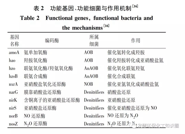 部分亞硝化-厭氧氨氧化過(guò)程主要依賴(lài)于AOB與AnAOB,其中功能細(xì)菌、功能基因及作用原理如表2所示,除AOB和AnAOB功能基因以外,還列出了NOB和反硝化細(xì)菌的功能基因。在部分亞硝化-厭氧氨氧化反應(yīng)過(guò)程中需要調(diào)控菌群結(jié)構(gòu),促進(jìn)AOB和AnAOB占優(yōu)勢(shì),其調(diào)控方法在第2、3部分進(jìn)行討論。