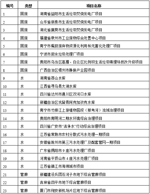 2017年5月24日,國家發(fā)展改革委選定了43個(gè)項(xiàng)目作為第二批PPP項(xiàng)目典型案例。環(huán)保類項(xiàng)目共23個(gè),占比高達(dá)53.5%,其中,固廢類項(xiàng)目8個(gè),水類項(xiàng)目12個(gè),管廊類項(xiàng)目3個(gè)。具體的項(xiàng)目名單見下表: