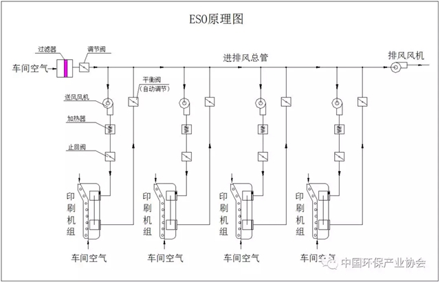 印刷生產(chǎn)→產(chǎn)生VOCs→ESO并聯(lián)節(jié)能→減風(fēng)循環(huán)。