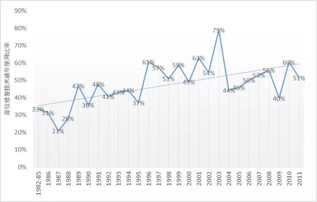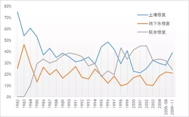 圖:超級基金場地中原位修復技術(shù)逐年使用比率