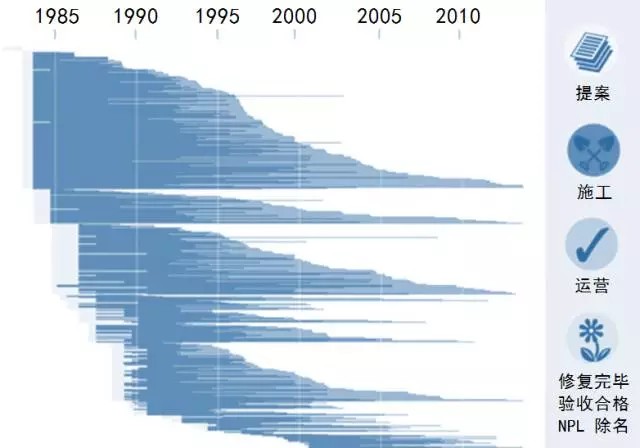 圖:超級基金各場地修復階段歷史進程(一條水平軸線代表一個場地)