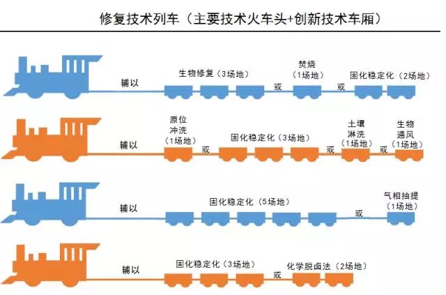 我國污染場地中污染物種類眾多,場地水文地質(zhì)條件各異,加之復合污染現(xiàn)象普遍,以及區(qū)域經(jīng)濟發(fā)展不同,傳統(tǒng)單項修復技術(shù)往往很難達到修復目標。發(fā)展協(xié)同聯(lián)合的土壤綜合修復模式,為場地提供因地制宜、最為高效經(jīng)濟的修復方案就必然成為行業(yè)趨勢。例如:傳統(tǒng)PRB修復方案聯(lián)合微生物處理、蒸氣抽提結(jié)合微生物修復、淋洗聯(lián)合固化穩(wěn)定化技術(shù)等。英語中這種多種技術(shù)聯(lián)合修復被形象的稱之為修復列車,它可顯著減少待治理的污染土壤量、提高修復效率、防止污染土壤開挖過程中VOC的排放并能同時處理多種類型污染物。在美國超級基金1995年的統(tǒng)計中,已有32個場地采用這種聯(lián)合修復模式。