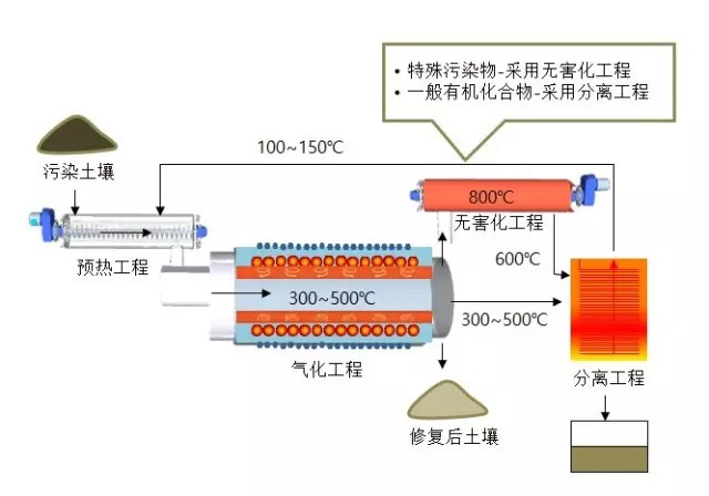 該技術(shù)的工作原理是在無氧環(huán)境下利用過熱蒸汽(500~800℃)和輻射熱將目標污染物進行氣化分離的技術(shù)。通過水和目標污染物的共沸現(xiàn)象,可在低于目標污染物沸點的溫度條件下實現(xiàn)污染物氣化,并對修復過程產(chǎn)生的污染蒸汽及凝縮水污染物進行分離處理。與以往的加熱方式相比,其修復成本較低。