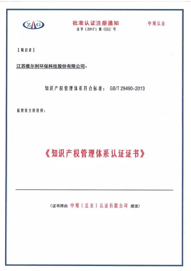 2017年6月,江蘇維爾利環(huán)??萍脊煞萦邢薰卷樌ㄟ^(guò)認(rèn)證,獲得GB/T29490-2013知識(shí)產(chǎn)權(quán)管理體系認(rèn)證證書(shū)。