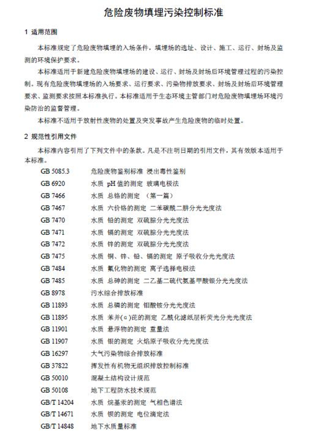 Standard for pollution control on the hazardous waste landfill