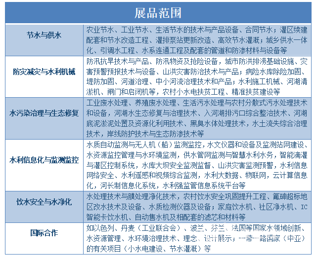 水環(huán)境治理技術(shù)的升級(jí),必然帶來(lái)涉水行業(yè)服務(wù)模式的升級(jí),傳統(tǒng)的商業(yè)模式已不能滿足新命題。在此背景下,水博會(huì)作為行業(yè)年度盛會(huì),特別將此次輻射網(wǎng)延伸至節(jié)水與供水、防災(zāi)減災(zāi)與水利機(jī)械、水污染治理與生態(tài)修復(fù)、水利信息化與監(jiān)測(cè)監(jiān)控、飲水安全與水凈化、國(guó)際合作六大領(lǐng)域。具體如下圖所示: