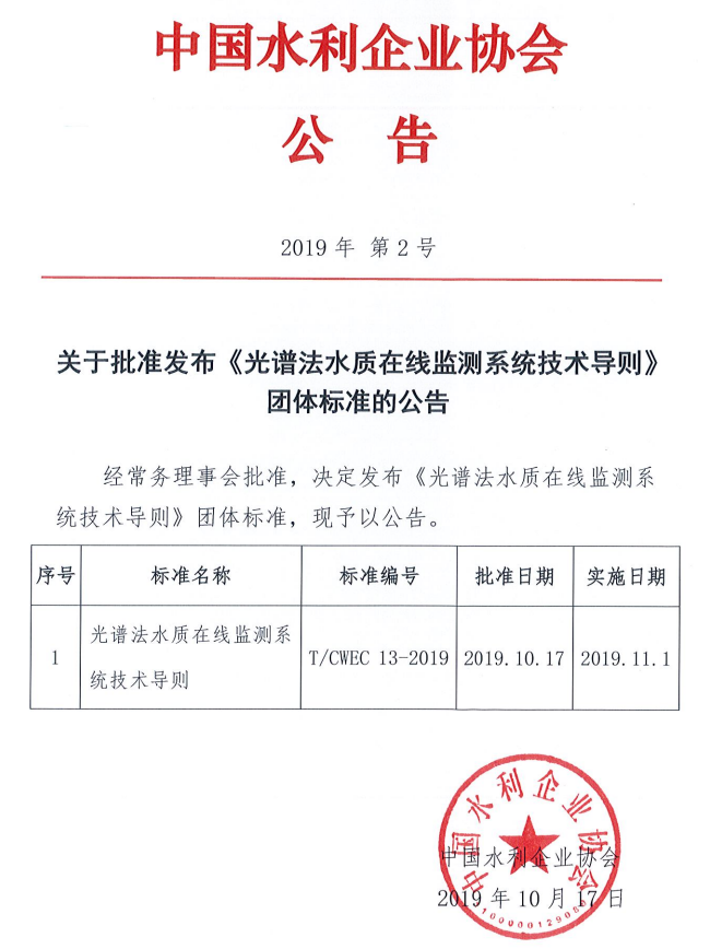 《光譜法水質在線監(jiān)測系統(tǒng)技術導則》(T/CWEC 13-2019)團體標準于2019年10月17日由中國水利企業(yè)協會發(fā)布,并于2019年11月1日實施。這是我國對光譜法水質在線監(jiān)測技術裝備市場與行業(yè)應用提出的第一個重要標準,填補了我國此項技術市場應用標準上的空白。