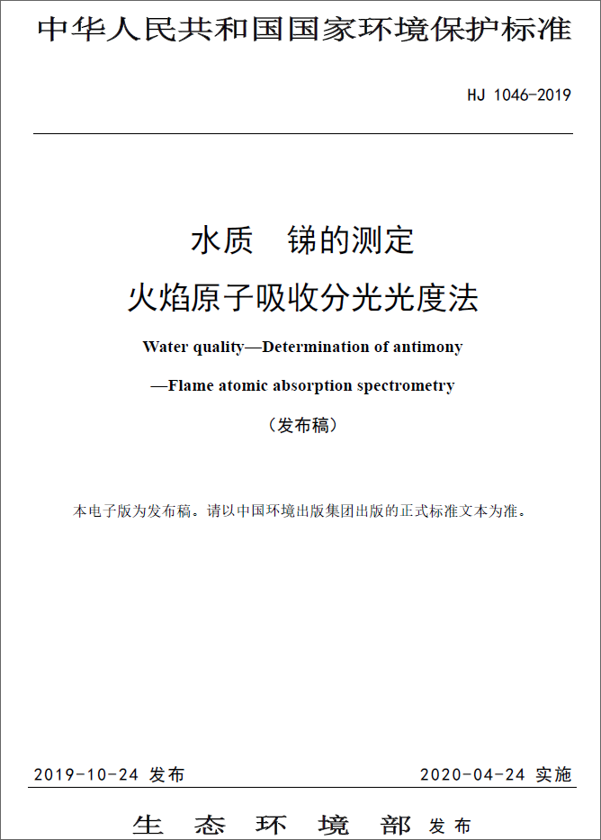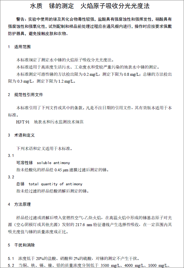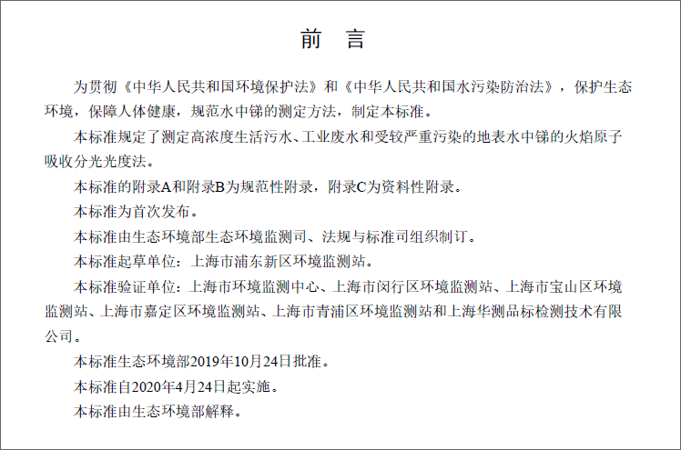 為貫徹《中華人民共和國環(huán)境保護法》和《中華人民共和國水污染防治法》,保護生態(tài) 環(huán)境,保障人體健康,規(guī)范水中銻的測定方法,制定本標準。本標準規(guī)定了測定高濃度生活污水、工業(yè)廢水和受較嚴重污染的地表水中銻的火焰原子吸收分光光度法。本標準的附錄A和附錄B為規(guī)范性附錄,附錄C為資料性附錄。本標準為首次發(fā)布。