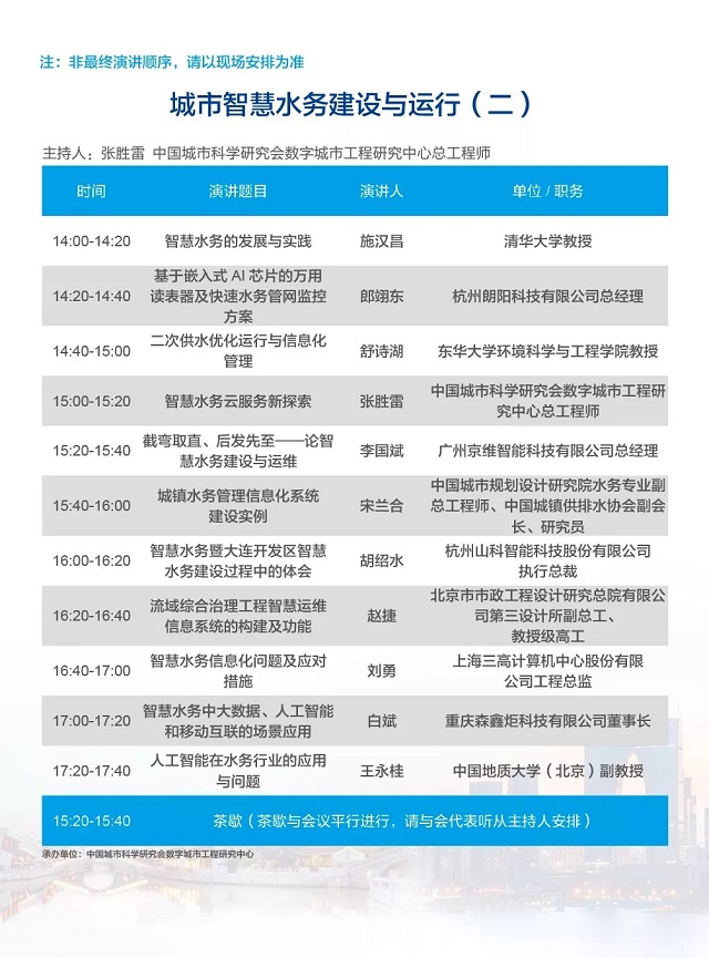 本次大會(huì)以推動(dòng)我國水資源的可持續(xù)利用、水行業(yè)的健康發(fā)展以及水生態(tài)文明的貫徹落實(shí)為使命,依托廣博深厚的學(xué)術(shù)網(wǎng)絡(luò),已邀請(qǐng)到多位國內(nèi)外院士、國家相關(guān)部委領(lǐng)導(dǎo)、國際組織首席科學(xué)家、水環(huán)境治理和城鎮(zhèn)水務(wù)領(lǐng)域頂尖研究院所專家和領(lǐng)先企業(yè)負(fù)責(zé)人就當(dāng)前國家政策、 經(jīng)濟(jì)形勢(shì)、技術(shù)創(chuàng)新、產(chǎn)品提升、運(yùn)營管理、智慧平臺(tái)建設(shè)、大數(shù)據(jù)分析等城鎮(zhèn)水務(wù)與水環(huán)境治理前沿話題進(jìn)行學(xué)術(shù)探討交流。