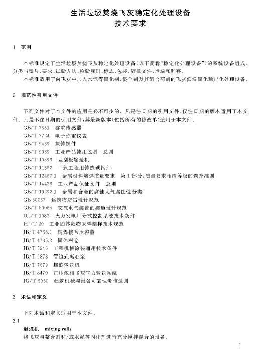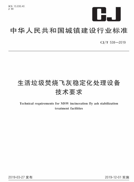 現批準《生活垃圾焚燒飛灰穩(wěn)定化處理設備技術要求》為城鎮(zhèn)建設行業(yè)產品標準,編號為CJ/T538-2019,自2019年12月1日起實施。