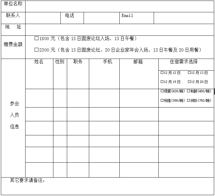 參會(huì)代表交通及住宿費(fèi)用自理。請(qǐng)將注冊(cè)費(fèi)匯款到指定賬戶(hù)并于2019年12月11日前并發(fā)參會(huì)回執(zhí)(附件2)至?xí)?wù)組郵箱:zghl@envirunion.com。