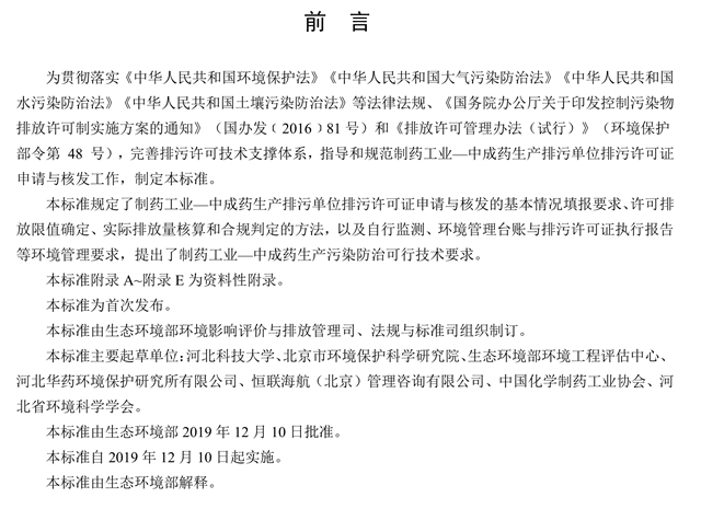 Technical specification for application and issuance of pollutant permit Pharmacy industry-Chinese traditional medicine manufacturing