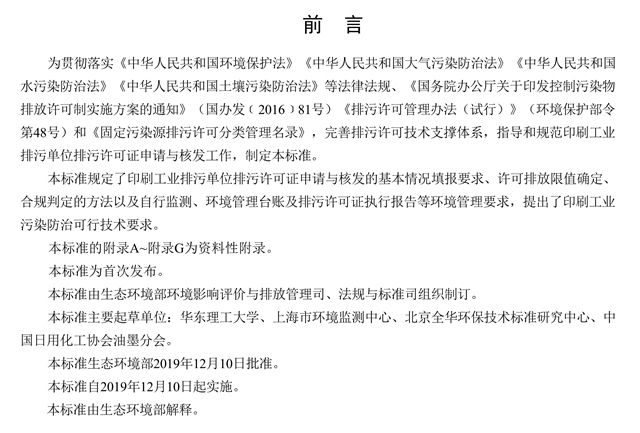 為貫徹落實(shí)《中華人民共和國環(huán)境保護(hù)法》《中華人民共和國大氣污染防治法》《中華人民共和國水污染防治法》《中華人民共和國土壤污染防治法》等法律法規(guī)、《國務(wù)院辦公廳關(guān)于印發(fā)控制污染物排放許可制實(shí)施方案的通知》(國辦發(fā)﹝2016﹞81號)《排污許可管理辦法(試行)》(環(huán)境保護(hù)部令第48號)和《固定污染源排污許可分類管理名錄》,完善排污許可技術(shù)支撐體系,指導(dǎo)和規(guī)范印刷工業(yè)排污單位排污許可證申請與核發(fā)工作,制定本標(biāo)準(zhǔn)。