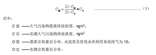 4.1.3 對(duì)于水泥窯及窯尾余熱利用系統(tǒng)排氣,應(yīng)同時(shí)對(duì)排氣中氧含量進(jìn)行監(jiān)測(cè),實(shí)測(cè)大氣污染物排放濃度應(yīng)按公式(1)換算為基準(zhǔn)含氧量狀態(tài)下的基準(zhǔn)排放濃度,并以此作為判定排放是否達(dá)標(biāo)的依據(jù)。其他車間或生產(chǎn)設(shè)施排氣按實(shí)測(cè)濃度計(jì)算,但不得人為稀釋排放。