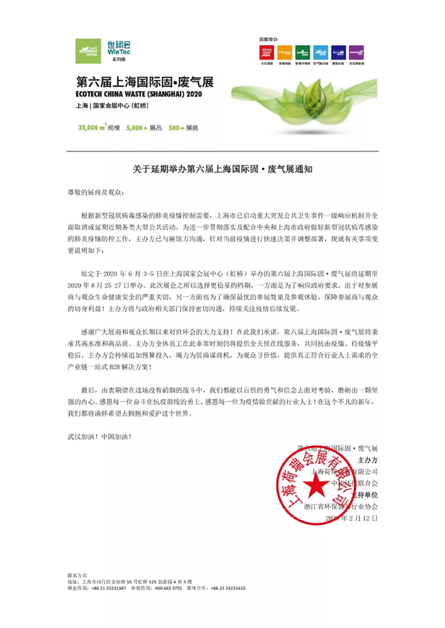 關(guān)于延期舉辦第六屆上海國際固·廢氣展通知