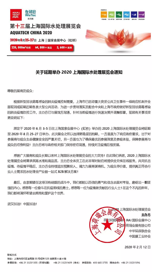 為全力支持打贏疫情防控阻擊戰(zhàn),貫徹落實(shí)上海市疫情防控工作領(lǐng)導(dǎo)小組的防疫工作指導(dǎo)方針,切實(shí)保障廣大展商和觀眾的身體健康和安全,確保展覽會(huì)的展示和觀展效果,原定于 2020 年 6月 3-5 日在上海國(guó)家會(huì)展中心(虹橋)舉辦的2020上海國(guó)際水處理展覽會(huì)將延期至2020年8月25-27日舉辦。主辦方將與政府相關(guān)部門保持密切溝通,持續(xù)關(guān)注疫情后續(xù)發(fā)展。