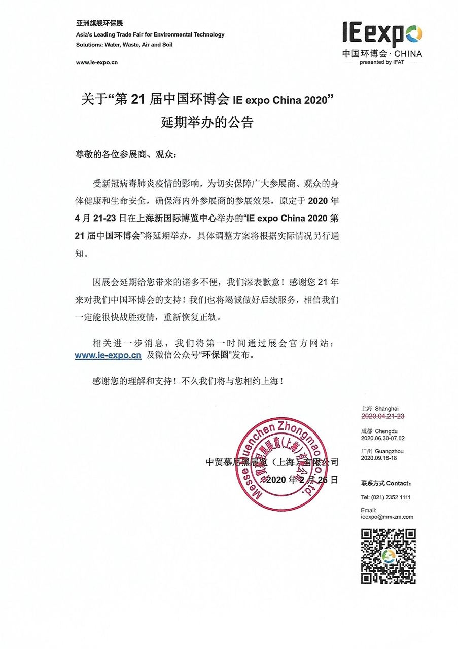 2月26日,中國環(huán)博會主辦方發(fā)布《關(guān)于“第21屆中國環(huán)博會IE expo China 2020”延期舉辦的公告》并宣布,原定于2020年4月21-23日于上海舉辦的第21屆中國環(huán)博會延期舉辦,“延期后的具體時間將另行通知”。