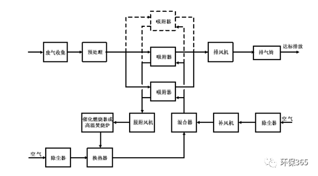 當(dāng)廢氣中的有機(jī)物不宜回收時(shí),宜采用熱氣流再生工藝。脫附產(chǎn)生的高濃度有機(jī)氣體采用催化燃燒或高溫焚燒工藝進(jìn)行銷毀。