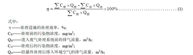 4.1.6 處理效率,指污染物控制設(shè)施去除污染物的量與處理前污染物的量之比,可通過同時測定處理前后廢氣中污染物的排放濃度和排氣量,以被去除的污染物與處理之前的污染物的質(zhì)量百分比計(jì),具體見(1)。