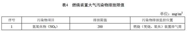 4.1.10 VOCs燃燒(焚燒、熱氧化)裝置除滿足表1、表3的大氣污染物排放要求外,還需要對排放煙氣中的氮氧化物進(jìn)行控制,且應(yīng)符合表4規(guī)定的限值要求。利用鍋爐、固廢焚燒爐焚燒處理有機(jī)廢氣的,還應(yīng)滿足相應(yīng)排放標(biāo)準(zhǔn)的控制要求。
