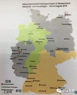 暫存設施建設不是為了污泥的處置,而是為了干化能夠與協(xié)同焚燒實現(xiàn)匹配。暫存設施的生存時間取決于協(xié)同焚燒與獨立焚燒的競爭情況、取決于新建獨立焚燒設施的投產(chǎn)時間和能力。本文作者認為,今后仍然有10%左右的處理后污泥采用土地利用的處置方式,大約每年有17萬t。但是在過渡期后,這一土地利用的量有可能還會減少。圖3是德國現(xiàn)狀和新建設施的地理分布情況。從焚燒設施的地域分布看,各州的能力是不平衡的。