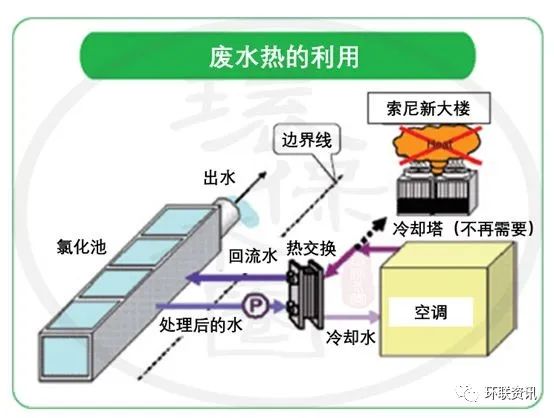將從水再生中心獲得的處理后的廢水供應(yīng)到新的索尼公司大樓,以冷卻大樓的空調(diào)設(shè)備??照{(diào)產(chǎn)生的廢熱,通過熱交換器處理后被廢水吸收。