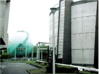 森崎水回收中心東部還設(shè)有有四個(gè)消化罐,用來從有機(jī)污泥成分中產(chǎn)生甲烷氣體,這將減少最終的污泥體積。每個(gè)消化罐內(nèi)徑28米,深度19.5米(容積12000立方米),消化溫度約為50攝氏度。
