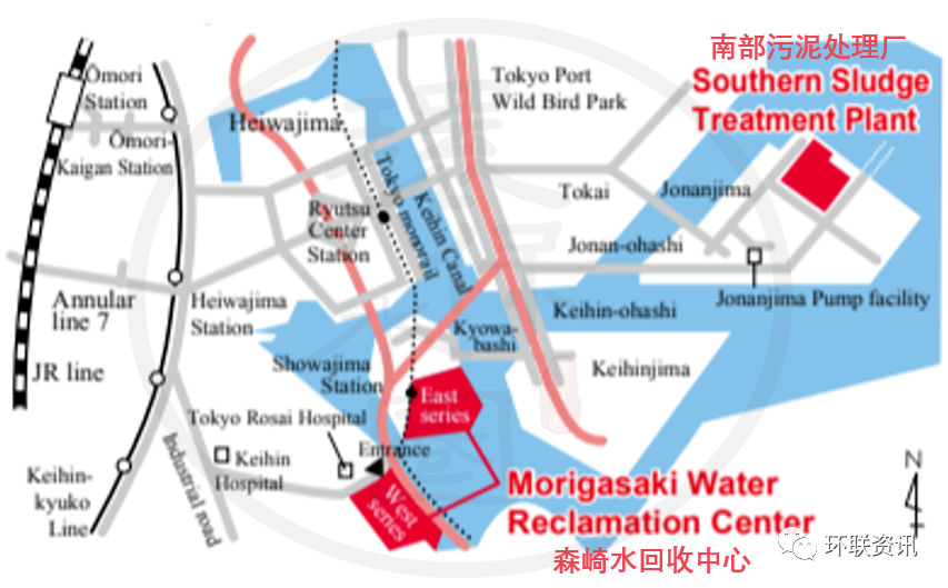 五座污水處理廠分別為:森崎水回收中心,芝浦水回收中心,川町水回收中心,落合水回收中心和有明水回收中心。